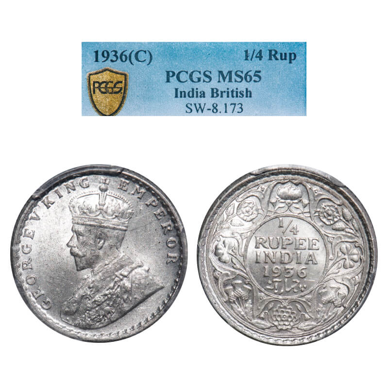 George V, Silver, 1/4 Rupee, 1936, Calcutta Mint, No dot. F. Prid 453. GK 1099. PCGS Slab MS 65. Very Rare.