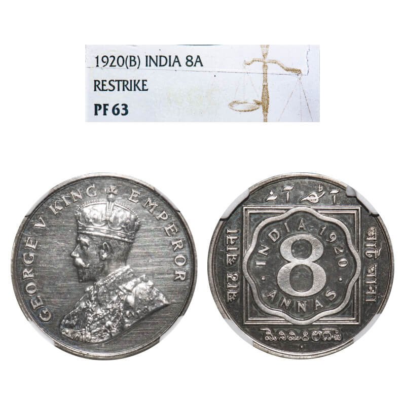George V, Copper-Nickel, 8 Annas, 1920, Proof Restrike, Bombay Mint, Dot. F. Prid. Paul Stevens & Randy Weir 8.135. GK Unlisted. NGC Slab PF 63 Restrike. Extremely Rare.