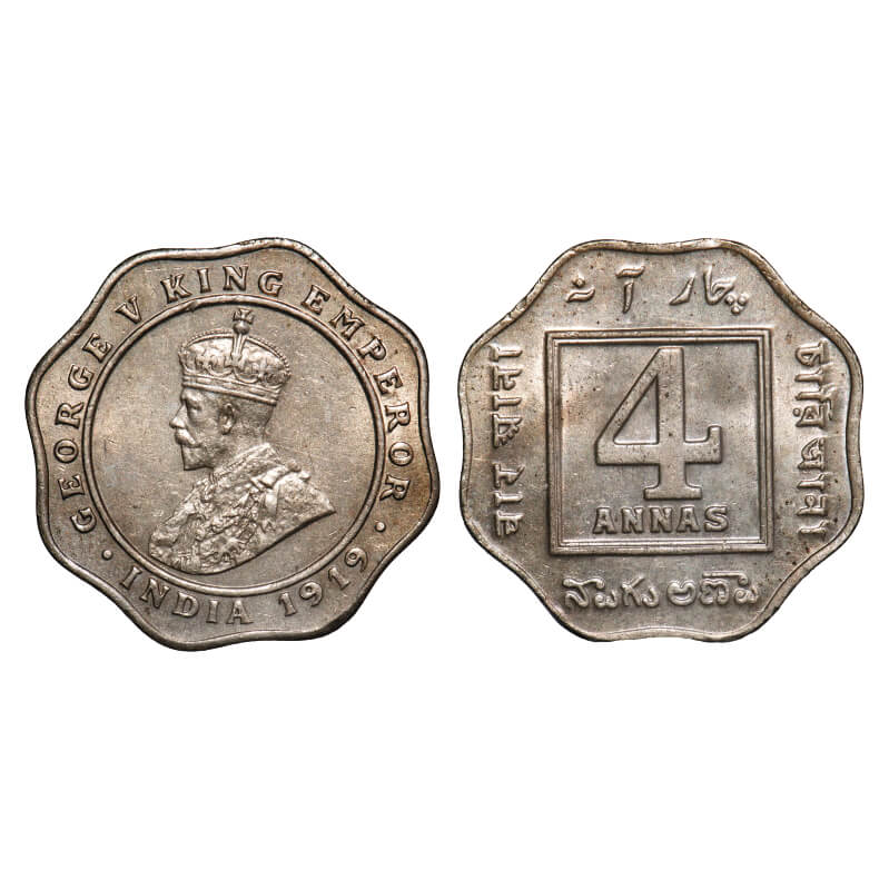 George V, Copper-Nickel, 4 Annas, 1919, Calcutta Mint, No dot. F. Prid 874. GK 1101. Almost Uncirculated. Rare.