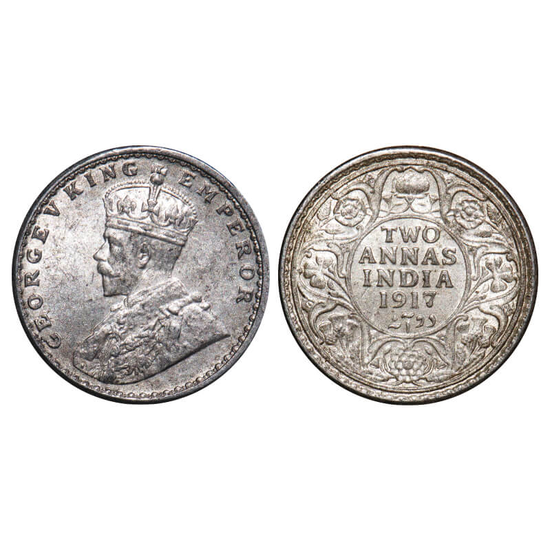George V, Silver, 2 Annas, 1917, Calcutta Mint, No dot. F. Prid 570. GK 1117. Uncirculated. Scarce.