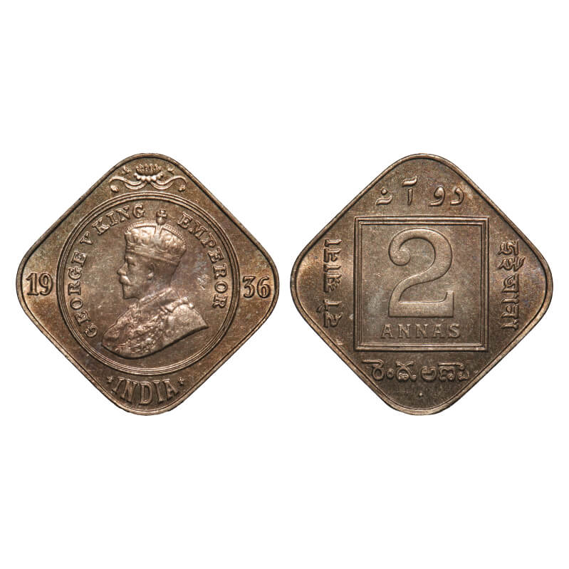 George V, Copper-Nickel, 2 Annas, 1936, Bombay Mint, Dot. F. Prid 903. GK 1140. Uncircutaled, Toned. Rare.