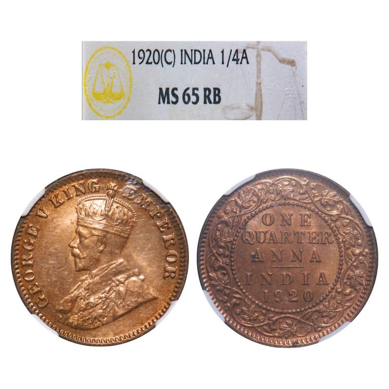 George V, Bronze, Quarter Anna, 1920, Calcutta Mint, No dot. F. Prid 665. GK 1179. NGC Slab MS 65 RB. Very Rare.