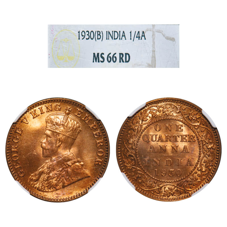 George V, Bronze, Quarter Anna, 1930, Bombay Mint, Dot. F. Prid 671. GK 1190. NGC Slab MS 66 RD. Extremely Rare.