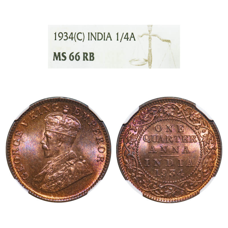 George V, Bronze, Quarter Anna, 1934, Calcutta Mint, No dot. F. Prid 674. GK 1194. NGC Slab MS 66 RB. Extremely Rare. (Highest graded coin in NGC and PCGS, Till date)