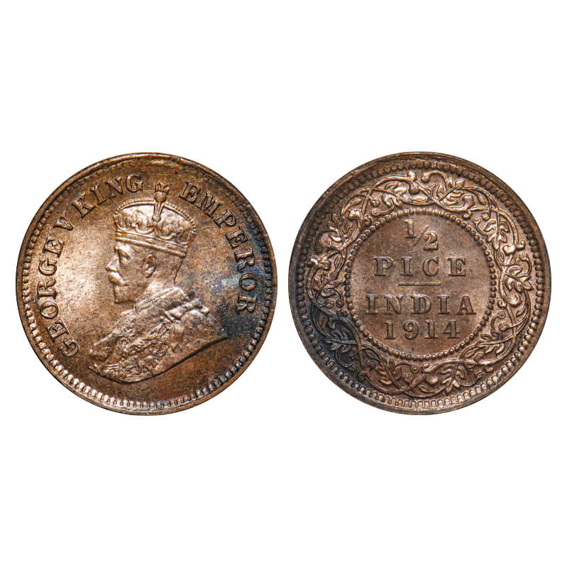 George V, Bronze, 1/2 Pice, 1914, Calcutta Mint, No mint mark. F. Prid 747. GK 1200. Brilliant Uncirculated. Very Rare.