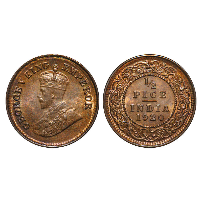 George V, Bronze, 1/2 Pice, 1920, Calcutta Mint, No mint mark, Ghost on Rev. F. Prid 753. GK 1206. Mint State. Very Rare.