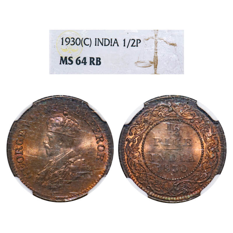 George V, Bronze, 1/2 Pice, 1930, Calcutta Mint, No mint mark. F. Prid 763. GK 1216. NGC Slab MS 64 RB. Very Rare.