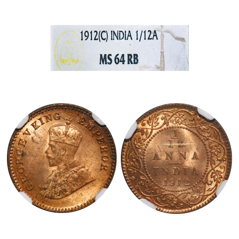 George V, Bronze, 1/12 Anna, 1912, Calcutta Mint, No dot. F. Prid 827. GK 1223. NGC Slab MS 64 RB. Rare.