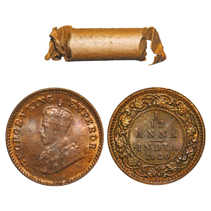 George V, Bronze, 1/12 Anna, (Roll of 24 coins), 1920, Calcutta Mint, No dot. Single mint coin roll. 24 coins in immaculate Grades in a Brown paper roll. F. Prid 835. GK 1231. Very Rare.