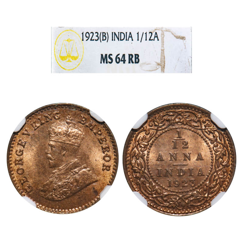 George V, Bronze, 1/12 Anna, 1923, Bombay Mint, Dot. F. Prid 851. GK 1233. NGC Slab MS 64 RB. Very Rare.