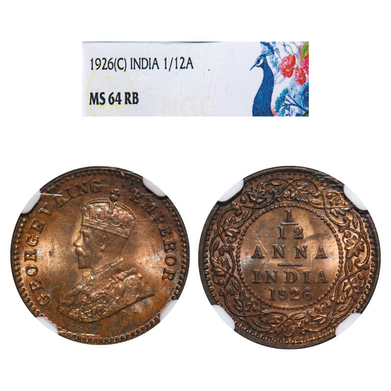 George V, Bronze, 1/12 Anna, 1926, Calcutta Mint, No dot. F. Prid 840. GK 1240. NGC Slab MS 64 RB. Very Rare.