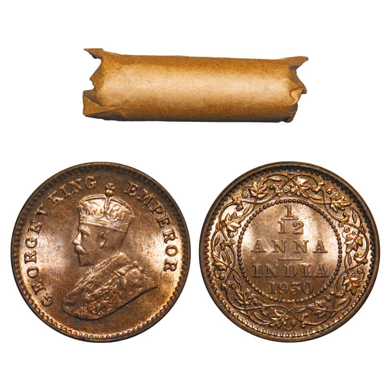 George V, Bronze, 1/12 Anna, (Roll of 24 coins), 1930, Calcutta Mint, No dot. Single mint coin roll. 24 coins in immaculate Grades in a Brown paper roll. F. Prid 844. GK 1246. Rare.