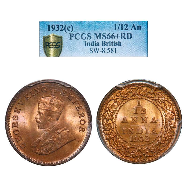 George V, Bronze, 1/12 Anna, 1932, Calcutta Mint, No dot. F. Prid 846. GK 1248. PCGS Slab MS 66+ RD. Extremely Rare.