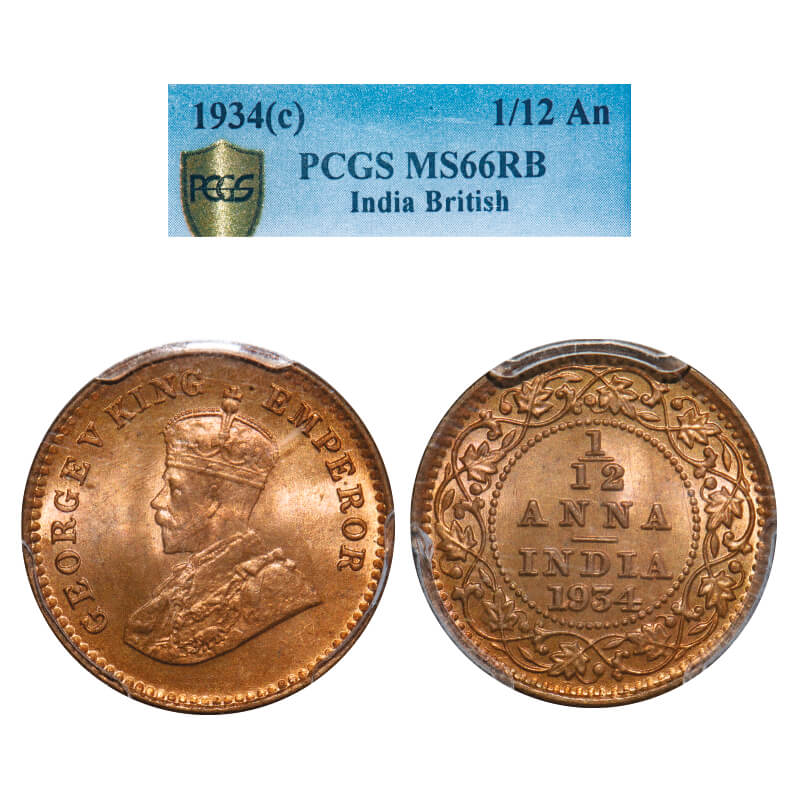 George V, Bronze, 1/12 Anna, 1934, Calcutta Mint, No dot. F. Prid 848. GK 1250. PCGS Slab MS 66 RB. Extremely Rare. (In NGC 6 coins are graded higher then MS 66 RB and in PCGS only 1 coin is higher then MS 66 RB, Till date)