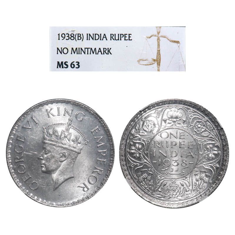 George VI, Silver, Rupee, 1938, Bombay Mint, A/I, No dot, Milled edge. F. Prid 233. GK 1254. NGC Slab MS 63. Very Rare.