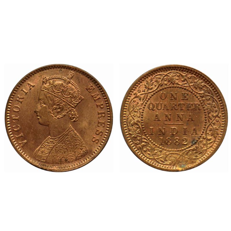 Victoria Empress, Copper Quarter Anna, 1882, Calcutta Mint, B/II, no mint mark. Nick on the edge of reverse below the date. GK 835.