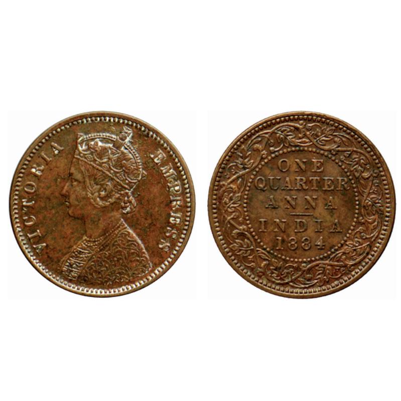 Victoria Empress, Copper Quarter Anna, 1884, Bombay Mint, B/I, no mint mark. GK 838.