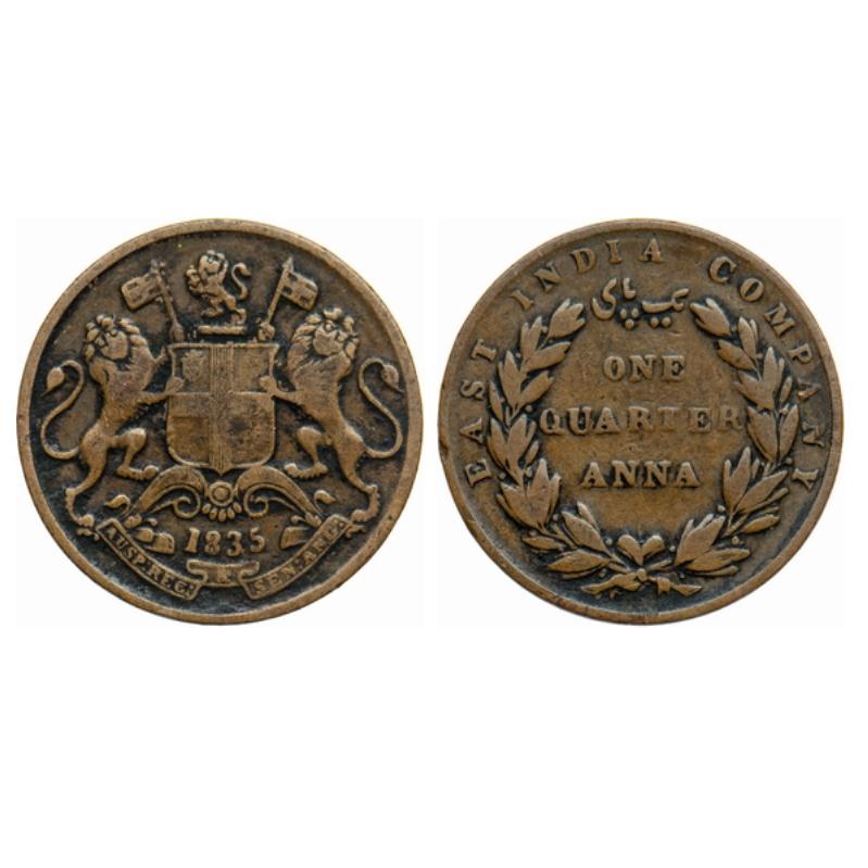 | William IV, Copper, Quarter Anna, 1835, Madras Mint, B / V, 24 Berries (13L + 11R), Y in company below a berry, shorter ribbon bow, wreath tips ends with 3 leaves. GK 152. |