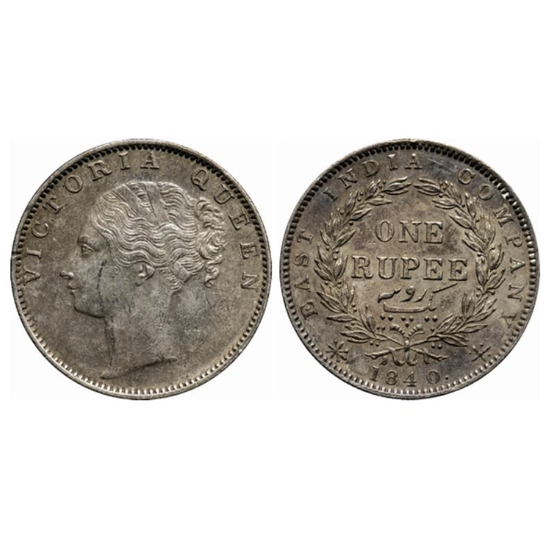 | Victoria Queen, Silver, Rupee, 1840, Continuous Legend, Calcutta Mint, D/VI(i), Indian Head, Wreath with 35 Berries (20L + 15R), But tiny Berry now removed and replaced by a big Berry opposite 'O' of One. GK 97. |