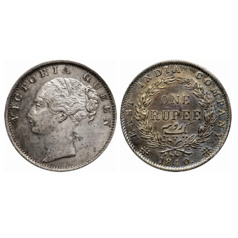 | Victoria Queen, Silver, Rupee, 1840, Continuous Legend, Calcutta Mint, C/VI, English head with completely modified features, Wreath with 35 Berries (20L + 15R), Always with tiny Berry opposite 'O' of One, Die cracks on Obv. GK 93. |