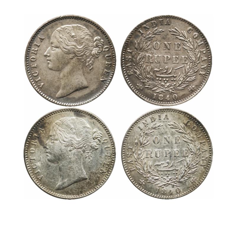 | Victoria Queen, Silver, Rupee (2 Coins), 1840, Calcutta Mint, Divided legend, 1) W.W. Raised, 2) W.W. Raised, 28 Berries (13L +15R), short cross bar in numeral 4. GK 163, 164. |
