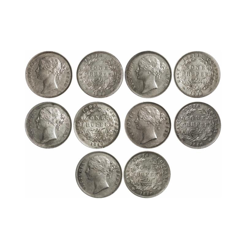 Victoria Queen, Silver, Rupee (5 Coins), 1840, Divided legend, Calcutta Mint W.W. raised 28 Berries (13L + 15R), gap between head and hairlock GK 166 (4 Coins), re-engraving of hairs connecting hairlocks (1 coin). GK 167.