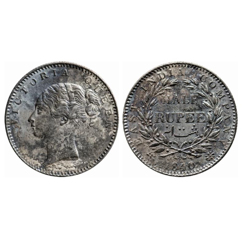 Victoria Queen, Silver, ½ Rupee, 1840, Continuous Legend, Bombay Mint, A/I, 19 Berries (9L + 10R)2 ...
