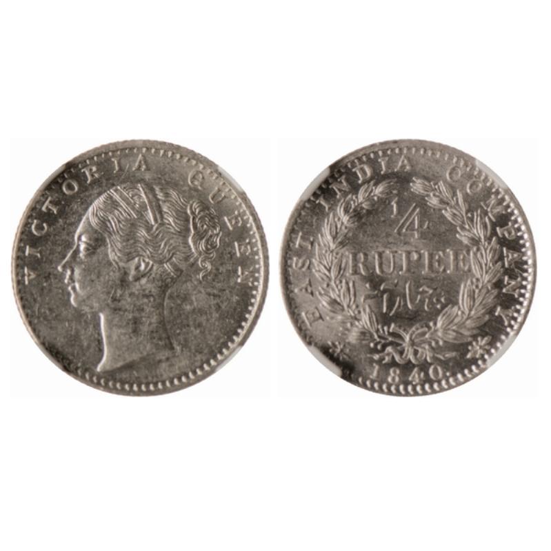 Victoria Queen, Silver, ¼ Rupee, 1840, Continuous Legend, Calcutta Mint, A/4, (19L + 15R berries). S&W-2.43.