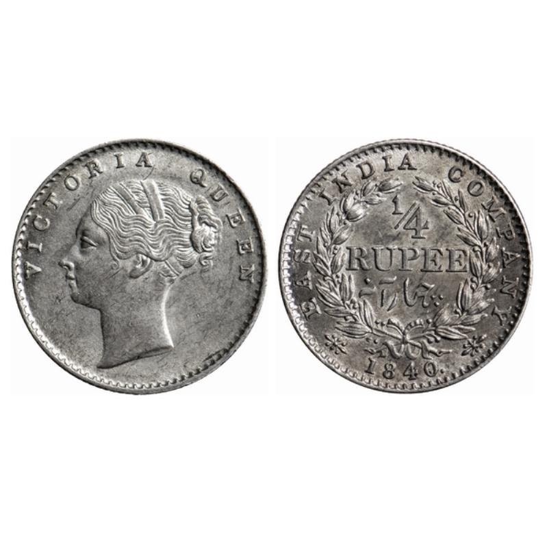 Victoria Queen, Silver, ¼ Rupee, 1840, Continuous legend, Calcutta Mint, A/I, Crescent on left ribbon. GK 124.