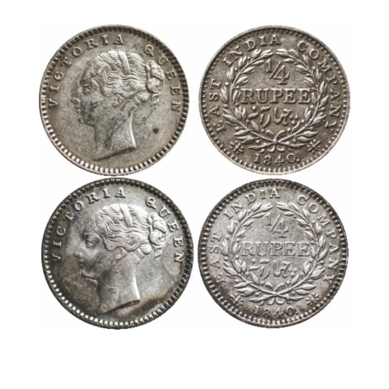 | Victoria Queen, Silver, ¼ Rupee (2 Coins), 1840, Continuous Legend, Madras Mint, S incused and V raised, A(a)/I, normal S, Wreath with 20 Berries (10L + 10R). GK 129. |