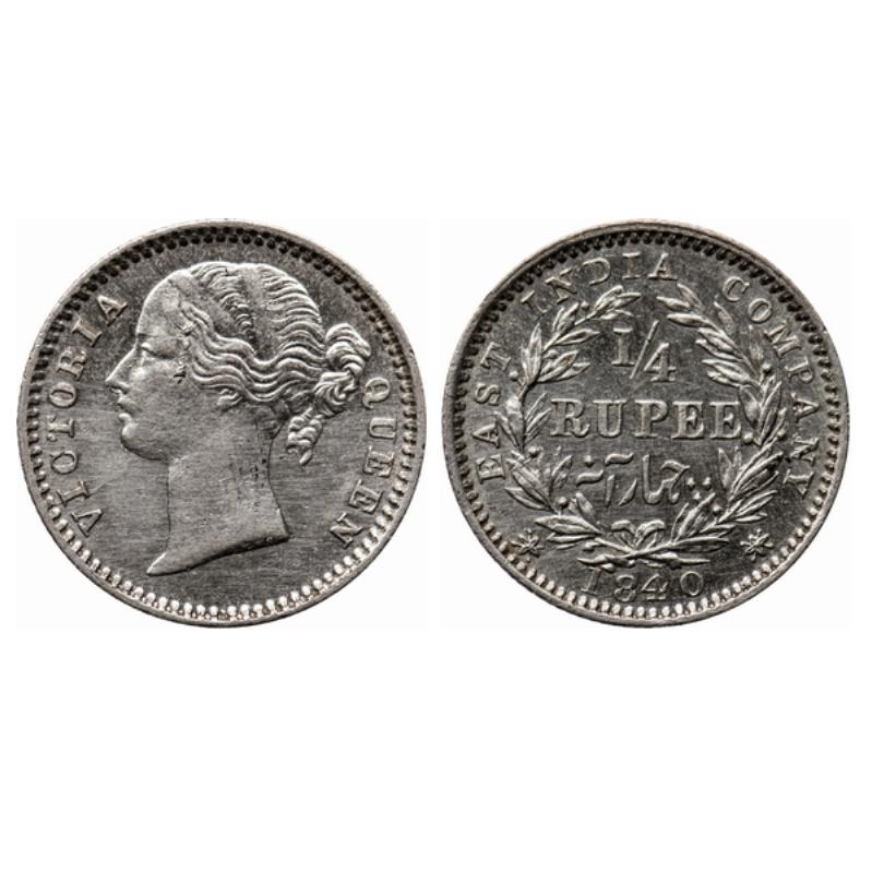 | Victoria Queen, Silver, ¼ Rupee, 1840, Divided Legend, Madras Mint, W.W. 'S' raised, 10 Berries (6L + 4R), numeral '4' without serif, die crack on obverse, extra metal on hair line. GK 204. |