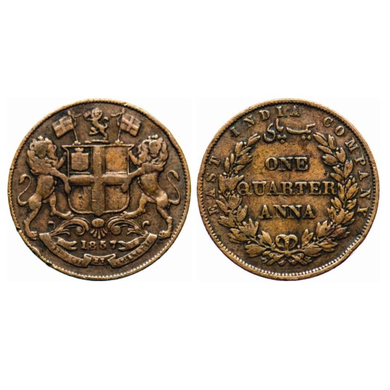 | Victoria Queen, EIC Issue, Copper, Quarter Anna, 1857, R. Heaton & Sons, Birmingham Mint, Two leaves, Reverse inverted. GK 230. |
