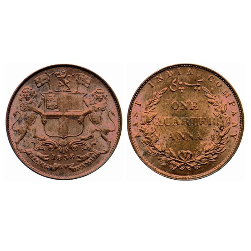 Victoria Queen, EIC Issue, Copper, Quarter Anna, 1858, J. Watt & Co. Birmingham Mint, Single leaf, reverse inverted. GK 229.
