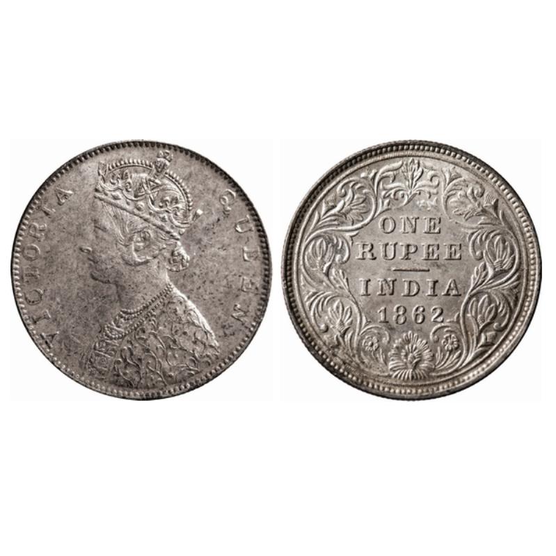 | Victoria Queen, Silver, Rupee, 1862, Bombay Mint, D/II(iv), The Queens Jabot had 4 and 3/4 or 5 panels, The Obverse is from L. C. Wyons revised die of 1863 Pattern Rupee, Experimental Coinage. GK 281. |