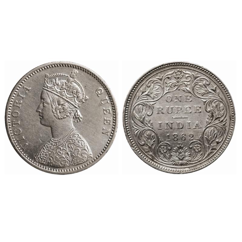 Victoria Queen, Silver, Rupee, 1862, Bombay Mint, A/II, 1/2 Dots, with initial 'J'. GK 357.