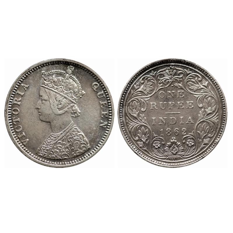 Victoria Queen, Silver, Rupee, 1862, Bombay Mint, C/II, 1/2 Dots, Slight Nick on the Reverse rim edge. GK 360.