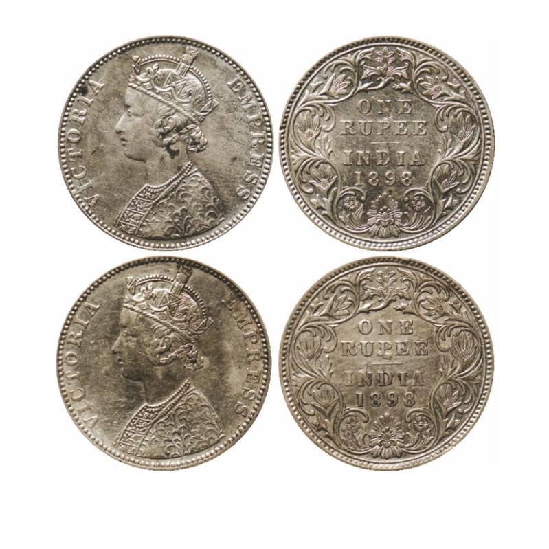 | Victoria Empress, Silver, Rupee (2 Coins), 1898, Bombay Mint, 'B' incused, traces of numeral 7 seen behind last numeral 8, C2/I, B incused. C2/ I(ii). GK 584, 585. |