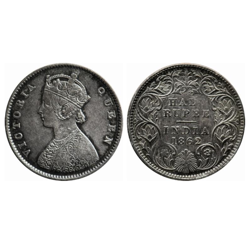Victoria Queen, Silver, ½ Rupee, 1862, Calcutta Mint, A/I, Round pearls, Alphabet 'F' of Half is die filled. GK 370.
