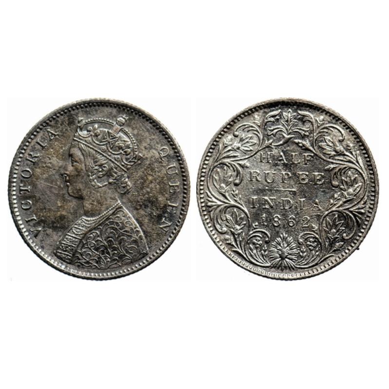 | Victoria Queen, Silver, ½ Rupee, 1862, Bombay Mint, B1/II, Round Pearls, Numeral 1 of the year has an oblique top serif, the bottom flower outer petals resembling as sharp shines of a porcupine. GK 371. |