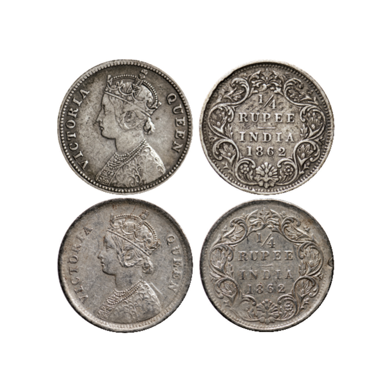 | Victoria Queen, Silver, ¼ Rupee (2 Coins), 1862, Calcutta Mint, A/I, Bombay Mint, A/I, Broken I of Victoria. GK 375, 377. |
