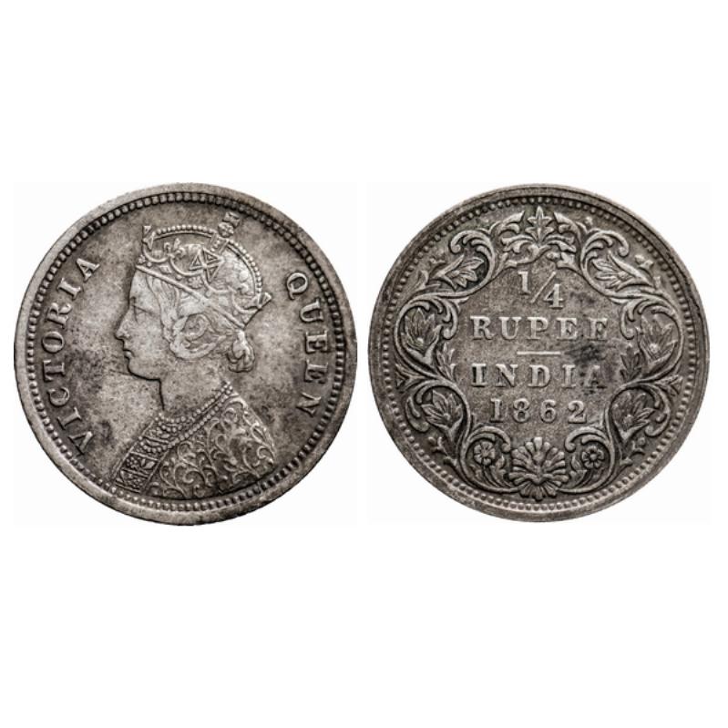 Victoria Queen, Silver, ¼ Rupee, 1862, Calcutta Mint, A/I, Numeral 1862 of year date are double str...