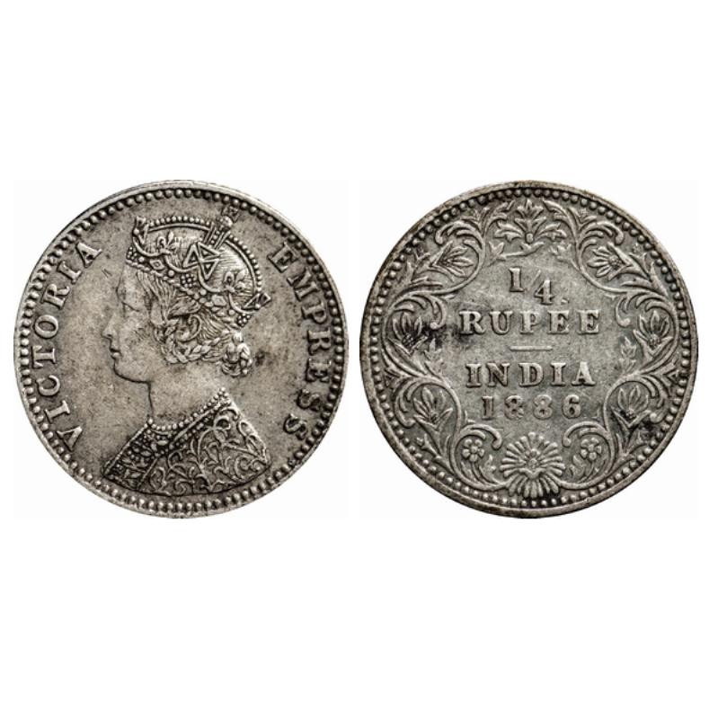 | Victoria Empress, Silver, ¼ Rupee, 1886, Bombay Mint, C(i)/II, B raised, without letter 'V', the bodice embroidery is bolder. GK 705. |