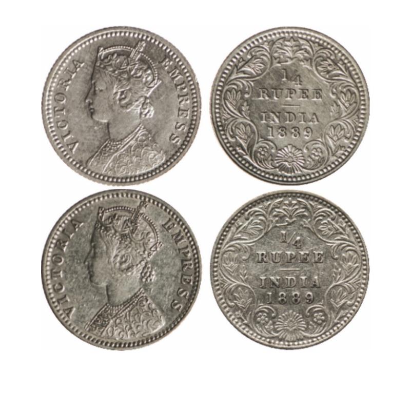| Victoria Empress, Silver, ¼ Rupee (2 Coins), 1889, Calcutta Mint, C/II, C incused, Bombay Mint, C(i)/II, B incused. GK 716, 715. |