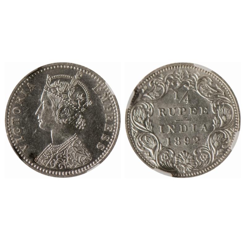 Victoria Empress, Silver, ¼ Rupee, 1892, Bombay Mint, C(i)/I, B incused, Reverse 1'o clock. GK 722.