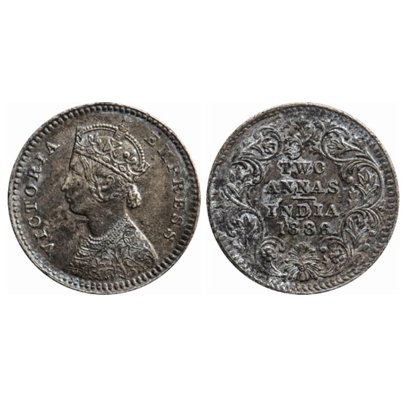 Victoria Empress, Silver, 2 Annas, 1886, Calcutta Mint, B/II, C incused. GK 782.