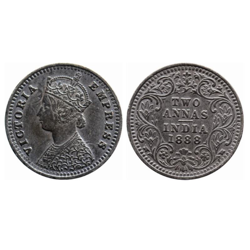 Victoria Empress, Silver, 2 Annas, 1888, Calcutta Mint, B/II, B incused, Ghost on Obv. GK 785.