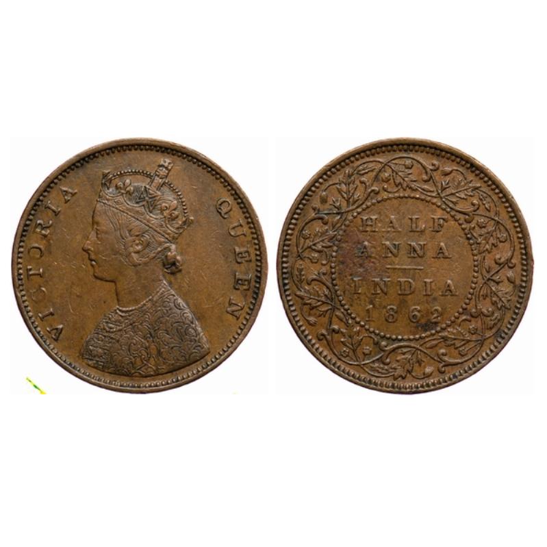 Victoria Queen, Copper, ½ Anna, 1862, Madras Mint, A/I, Smugde type flowers. GK 390.
