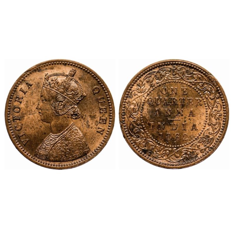 Victoria Queen, Copper, Quarter Anna, 1862, Madras Mint, A/I, no mint mark. GK 399.