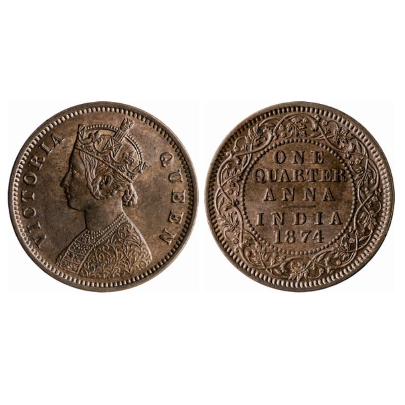 Victoria Queen, Copper, Quarter Anna, 1874, Calcutta Mint, B/II, No mint mark. GK 823.