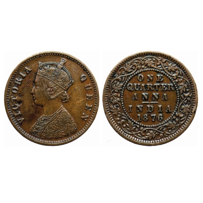 Victoria Queen, Copper, Quarter Anna, 1876, Calcutta Mint, B/II, no mint mark. GK 827.